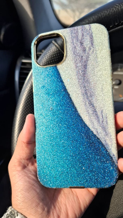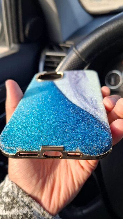 قاب لاکچری آیفون Blue Marble Shine | طرح مرمری براق آبی–بنفش + فریم طلایی دوربین