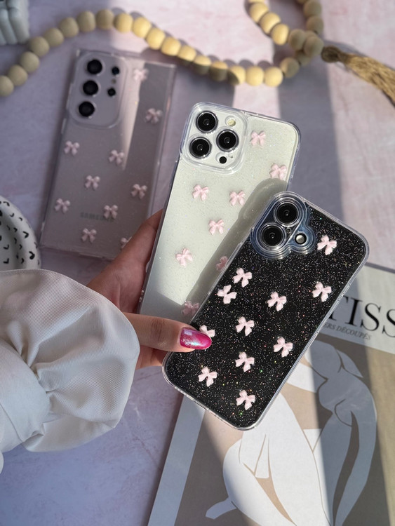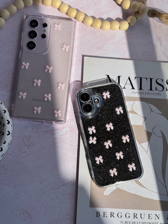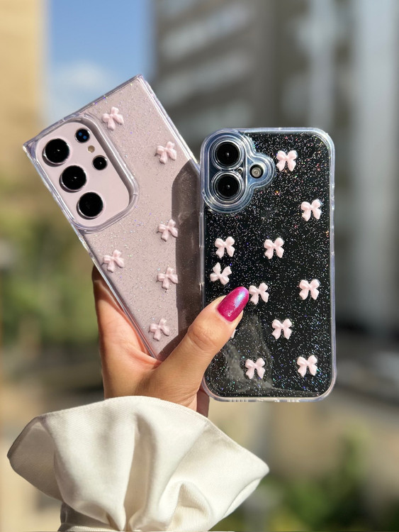 با قاب پاپیون صورتی روی زمینه شفاف اکلیلی، گوشی آیفون خود را در برابر خط و خش محافظت کنید و همزمان استایلی خاص و براق داشته باشید.