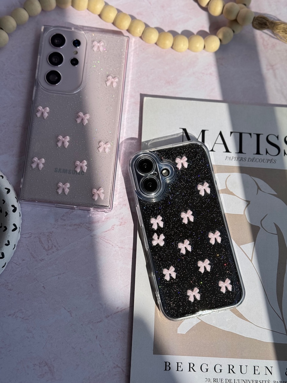با قاب پاپیون صورتی روی زمینه شفاف اکلیلی، گوشی سامسونگ خود را در برابر خط و خش محافظت کنید و همزمان استایلی خاص و براق داشته باشید.