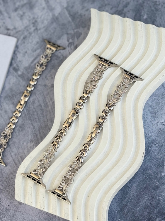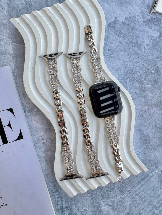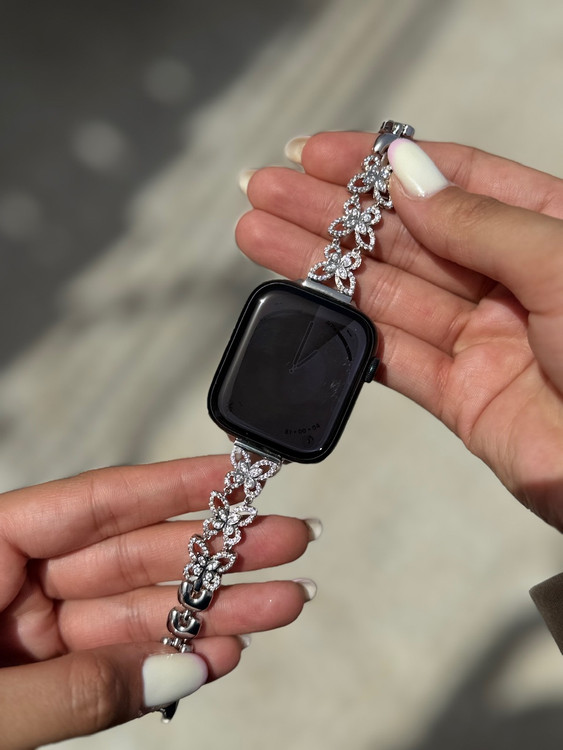 بند استیل اپل واچ با طراحی پروانهای و نگینهای براق، مناسب مجالس و استفاده روزمره. سازگار با سایزهای مختلف اپل واچ برای بانوان خوشاستایل.