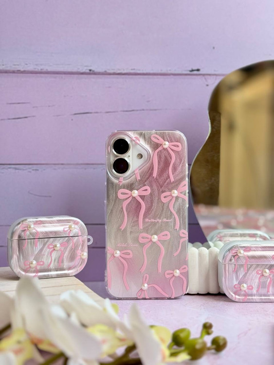 قاب گوشی شفاف با پسزمینه ترکیب رنگ مرواریدی و روبانهای برجسته صورتی با مروارید تزئینی. استایلی لطیف، فانتزی و بسیار خاص برای خانمهایی که به ظرافت اهمیت میدهند.
